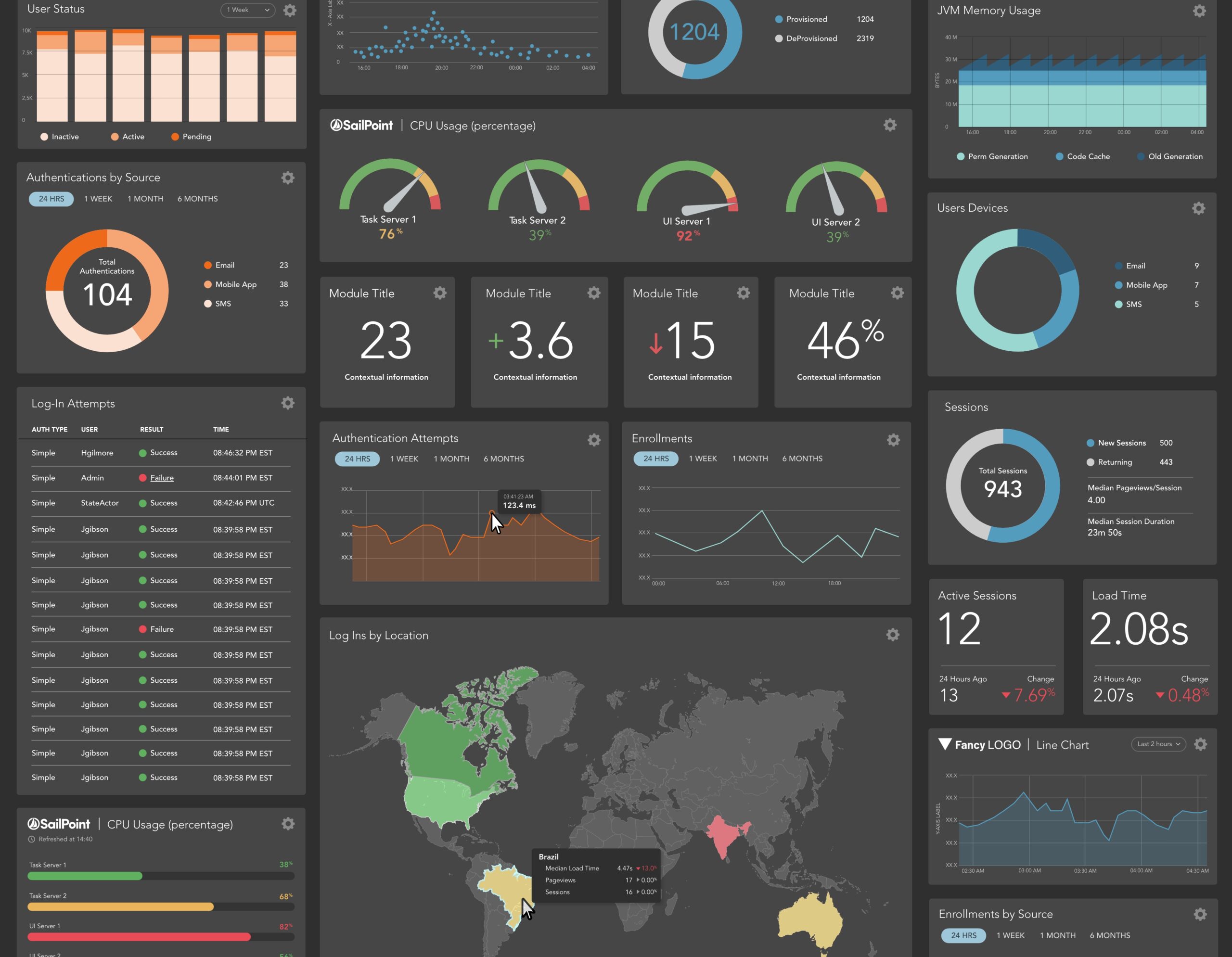 A collection of data feeds that help security analysts monitor the health of their client’s digital systems. I was responsible for creating a visual style and conceptualize the best method to display each data feed.