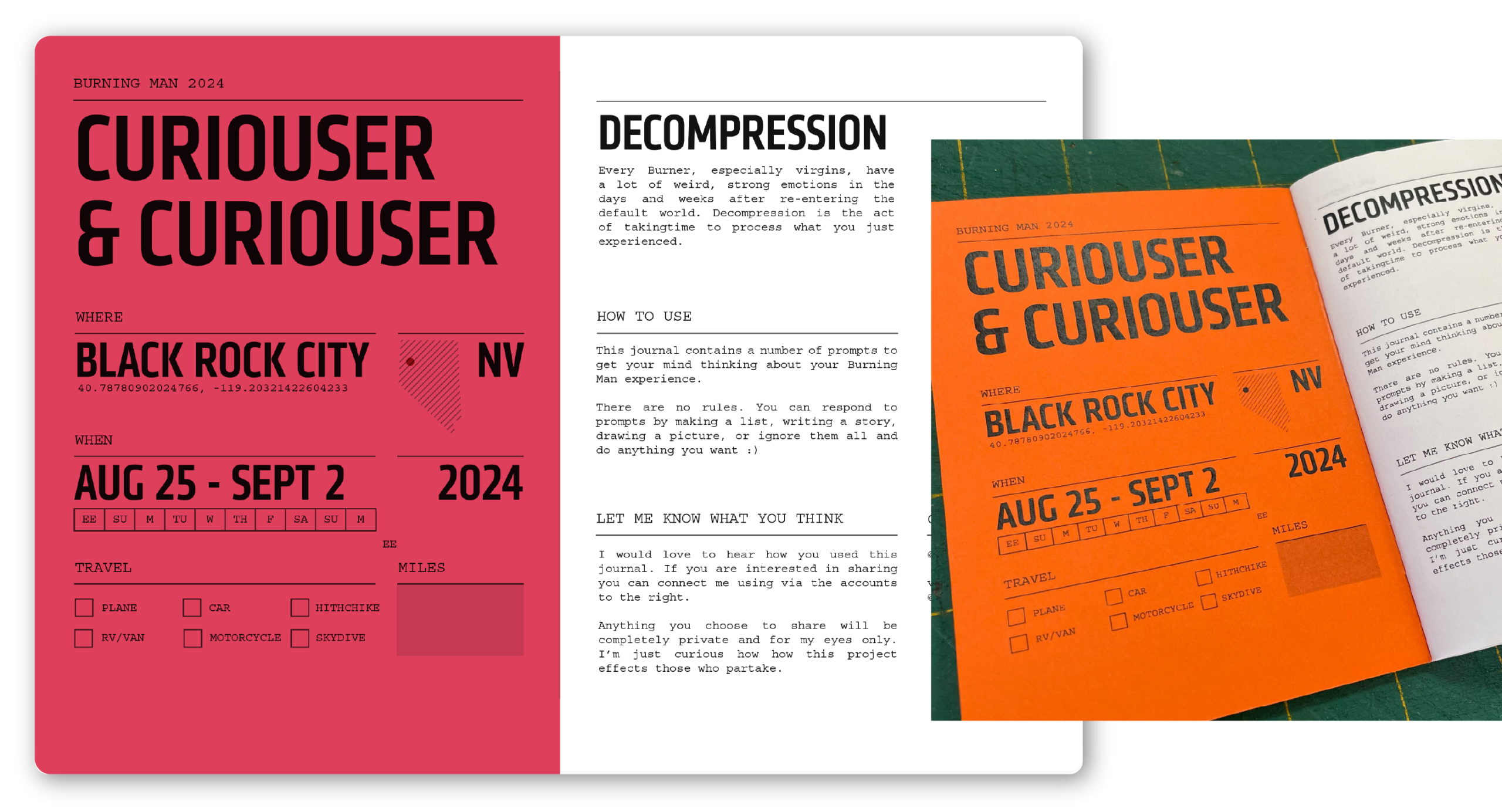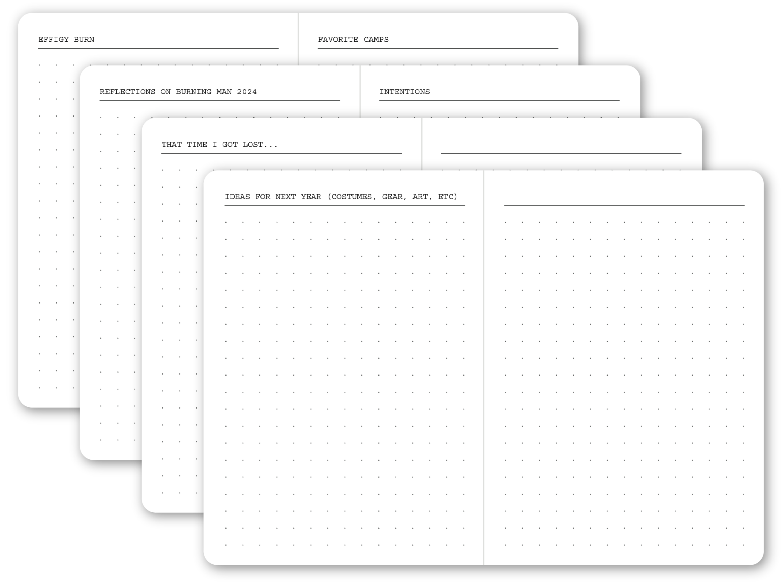 A pocket journal filled with prompts to help Burning Man attendees record and contextualize their experience in Black Rock City.