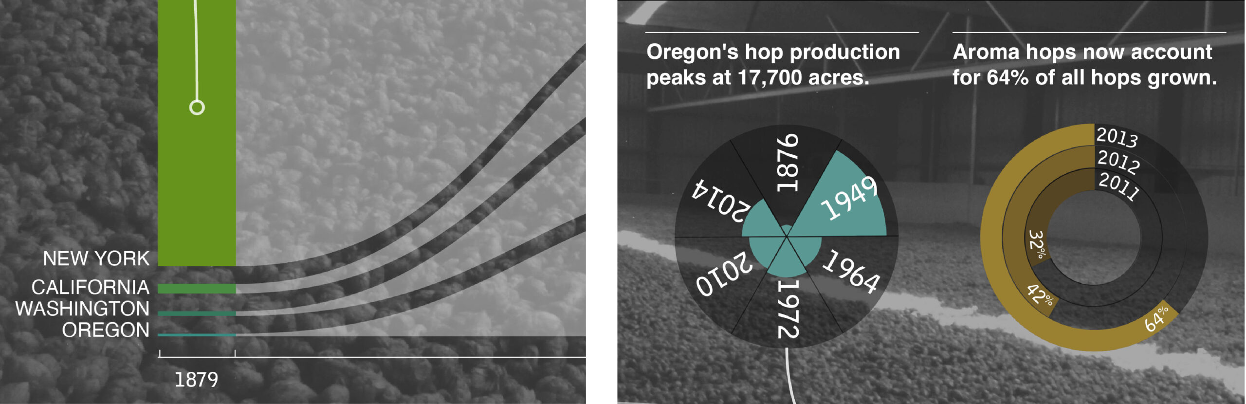 A data visualization I created for Beer Advocate magazine that plots the history of hops production (by acreage) in the United States.
