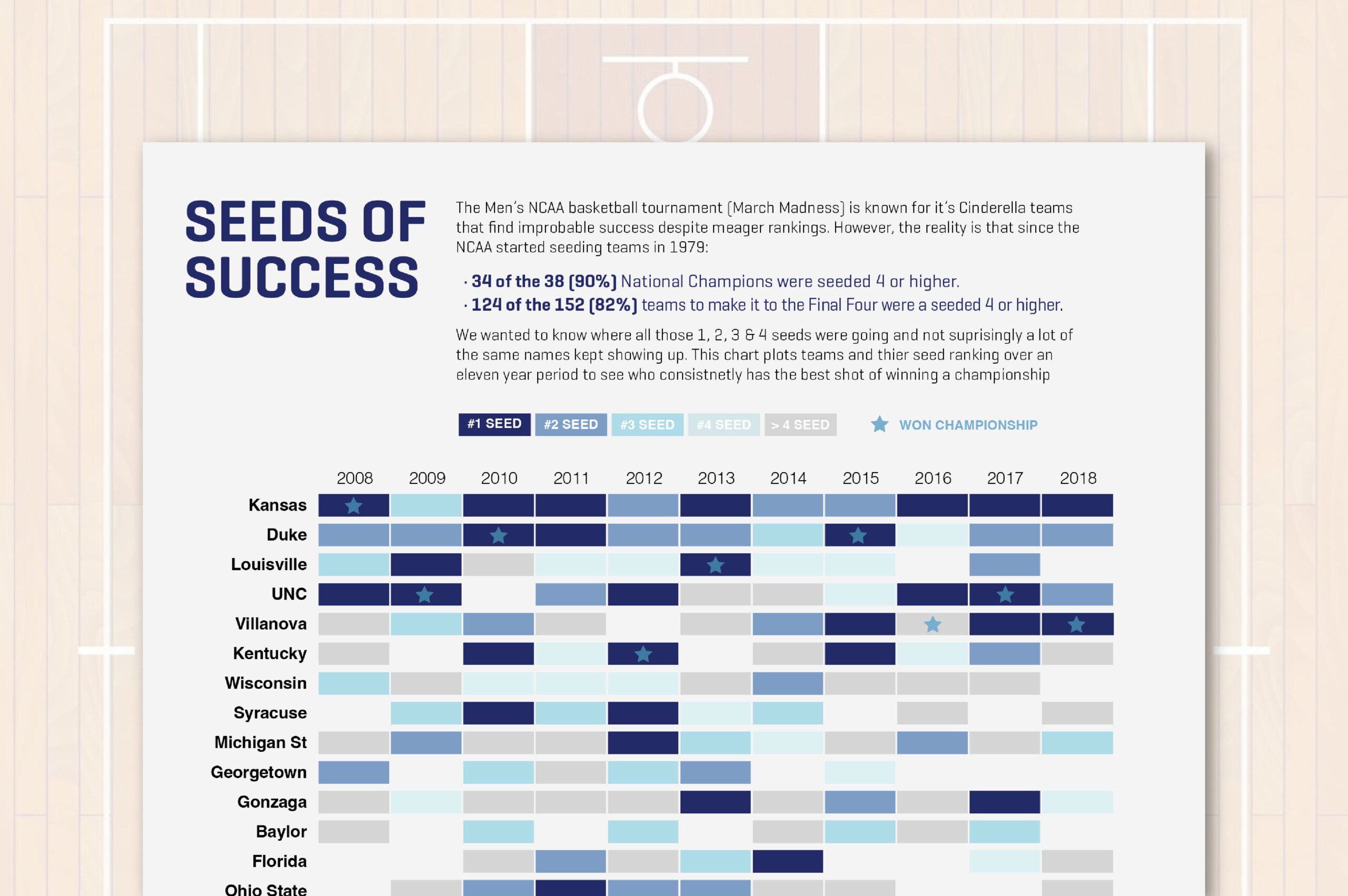 A data visualization created to look at how the team seedingĀ for the NCAA Basketball Tournament relate to actual championships. It charts an eleven year span of some of the common names in men’s college basketball.