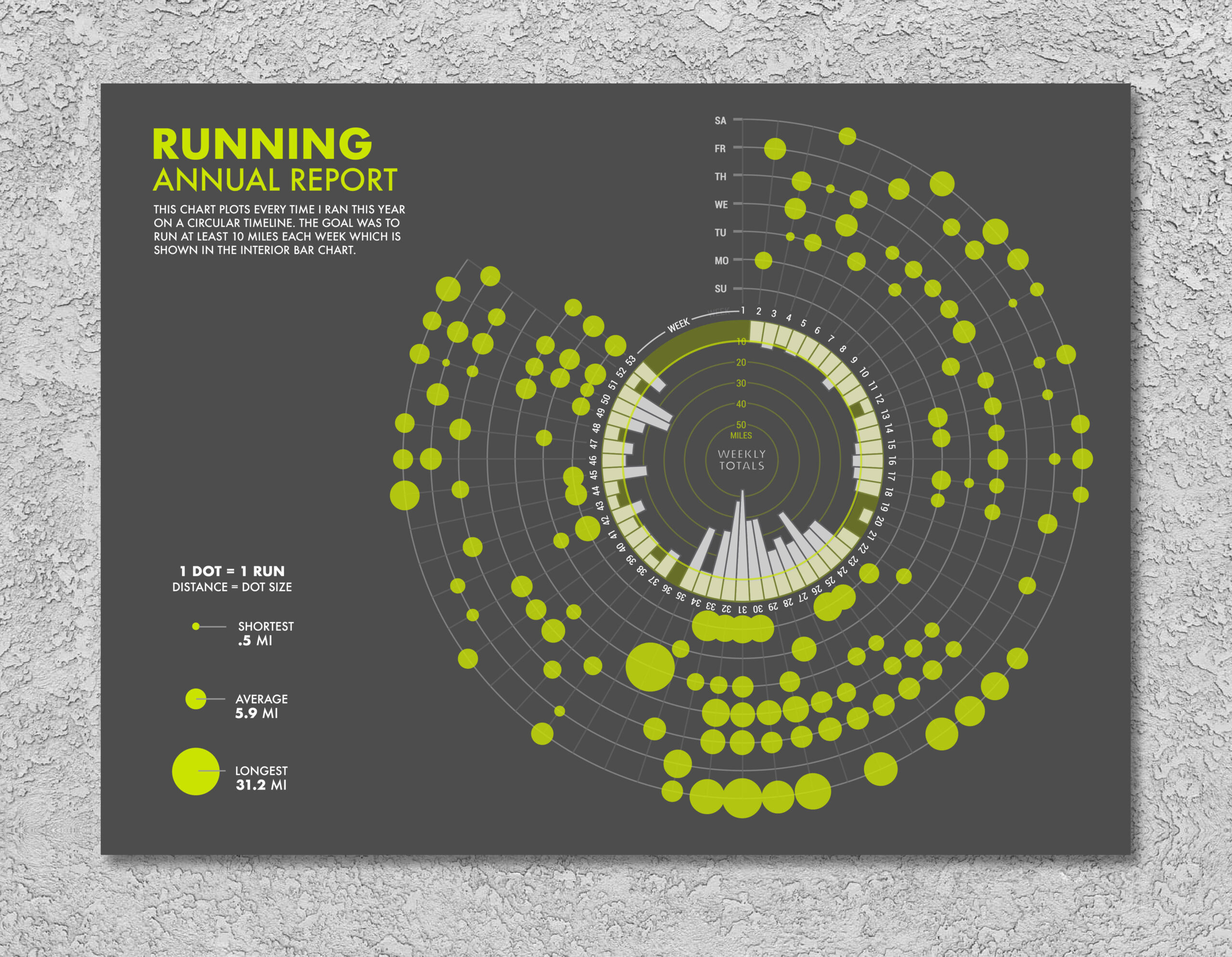 This self-initiated project visualized a year of my running data—born from marathon training sessions where I’d daydream about the shape my of my data as a way to distract myself from the miles being ran.
